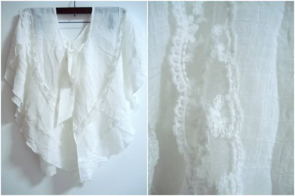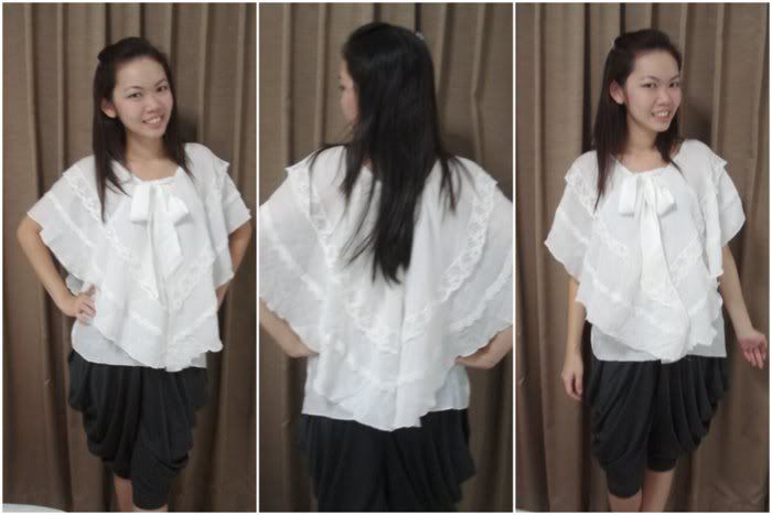 SOLD OUT ![]() ![]() ![]() ![]() Inspired by what Taiwanese Diva, Jolin Tsai was recently spotted in, this frilly white top is to die for. Love the little lace details as well.. Pinch a bit of Jolin’s chic, Pair it with shorts or better yet, with skinny and a stiletto. Totally Gorgeous. Made of cotton, not sheer. Size: Fit local S and M Price: S$26 |